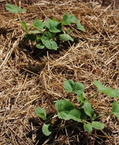 At harvest time, vegetables which sprawl on the ground, such as cucumbers, squash, strawberries, unstaked tomatoes, etc., often become moldly or even develop rot. Others may be damaged by falling onto uncovered soil. A mulch prevents such injury by keeping the vegetables clean and dry, and by providing a cushioned layer on which they can rest or drop.